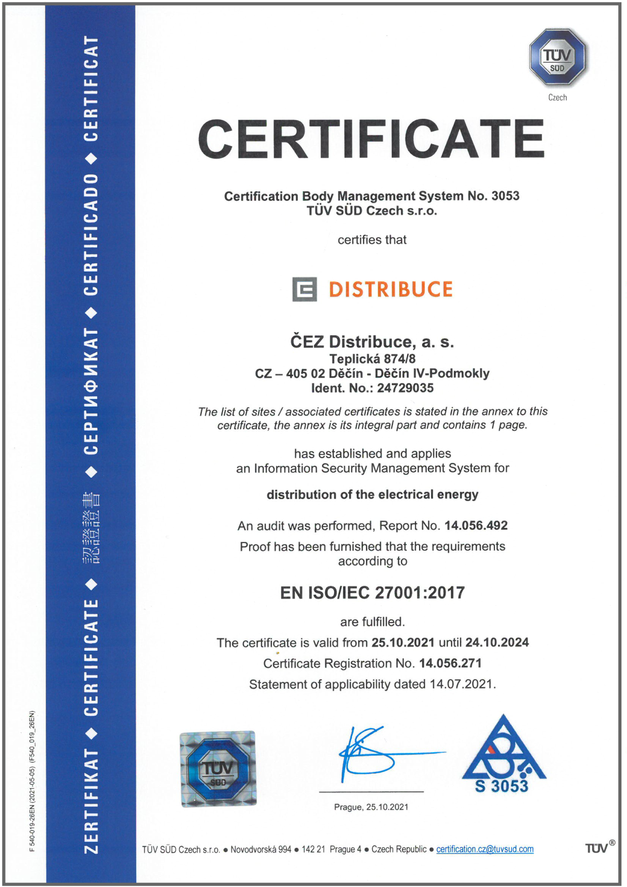 ČEZ Distribuce je držitelem ocenění „Bezpečný podnik". Program „Bezpečný podnik“ je jedním ze způsobů, jak zavést systém řízení bezpečnosti a ochrany zdraví při práci do celkového managmentu a docílit tak vyšší úrovně bezpečnosti a ochrany zdraví. Také je držitelem certifikátu „Systém řízení bezpečnosti informací“ (ISMS) dle ISO 27001.