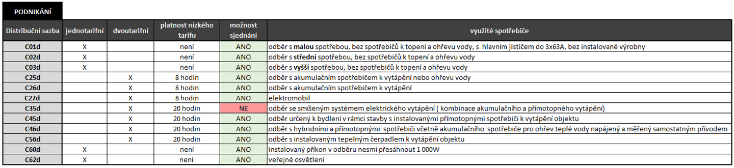 Na této stránce uvádíme základní přehled distribučních sazeb pro podnikatele (platnost k 1. 1. 2025). Pokud vás zajímají detailní informace k jednotlivým sazbám, najdete je v dokumentu Podmínky distribučních sazeb pro podnikatele