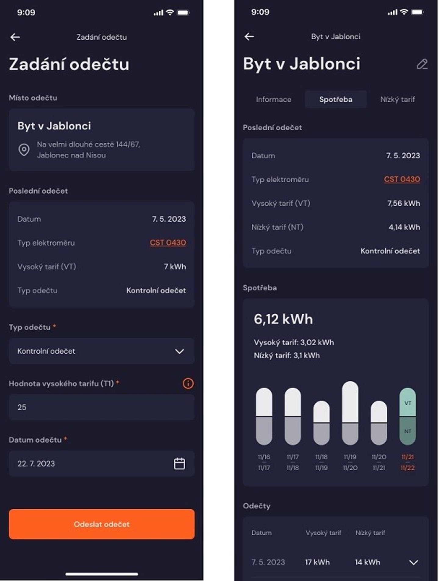 V aplikaci si můžete prohlédnout spotřebu na vašem odběrném místě mezi oficiálními periodickými odečty (například od července 2021 do července 2022). V historii odečtů pak najdete všechny evidované odečty u distributora.